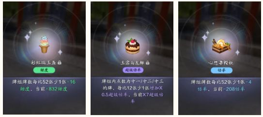 核心加成甜品为彩虹瑞玉盏(牌组牌数每比52张少1张+16甜度)、心想事橙糕(牌组牌数每比52张少1张+4倍率)、玉露乌龙酥(牌组内点数为“十一/十二/十三”的牌,每比12张少1张增加X0.5超级倍率);