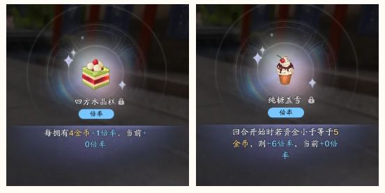 无积分加成效果,但在满足特定条件后可以获得金币,可进行更多的购买及商店刷新。一般作为前中期挂件存在,后期一般会换成加成类甜品。