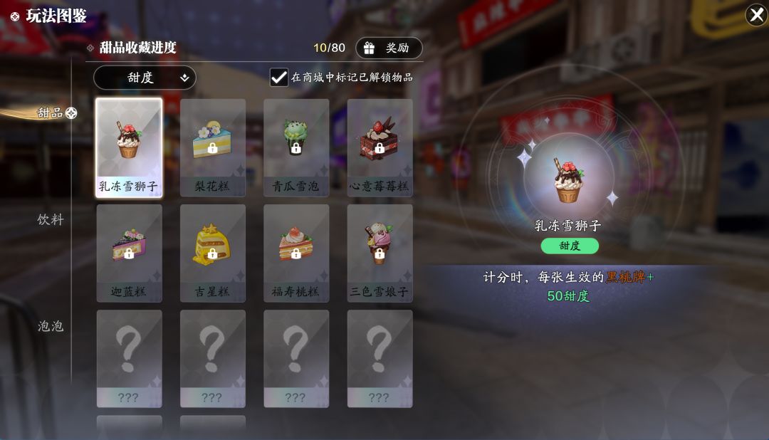 核心甜品为四方水晶糕(每拥有4金币+1倍率)和梨花糕(每拥有1金币+1甜度)。