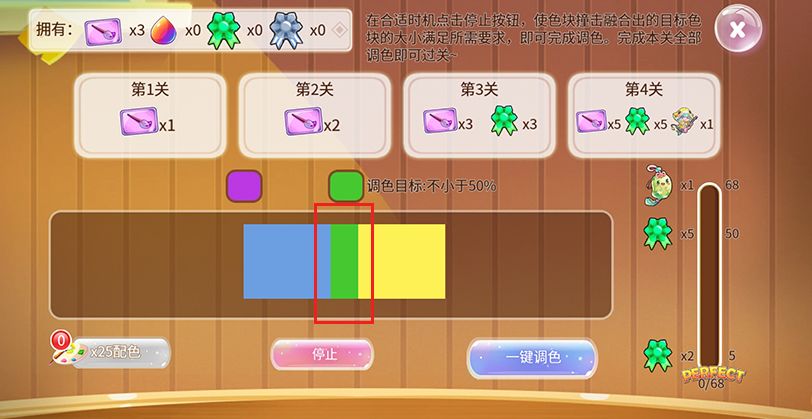 黄+蓝变绿!在合适的时机按下停止按钮,色块融合出的目标颜色符合要求即可完成调色任务!