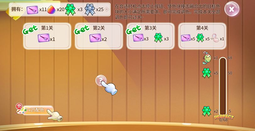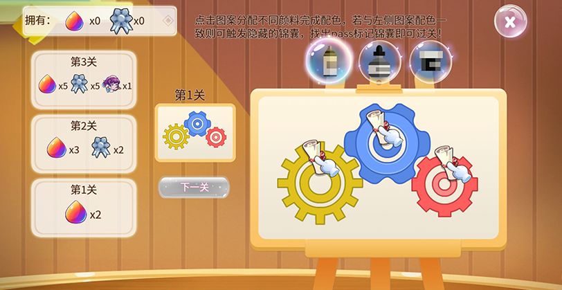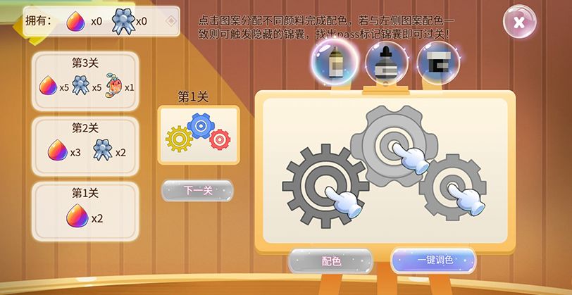 如果配出的颜色和左侧中间位置提示的颜色相同,即可触发锦囊、过关领取奖励~完成后,进入作画环节。