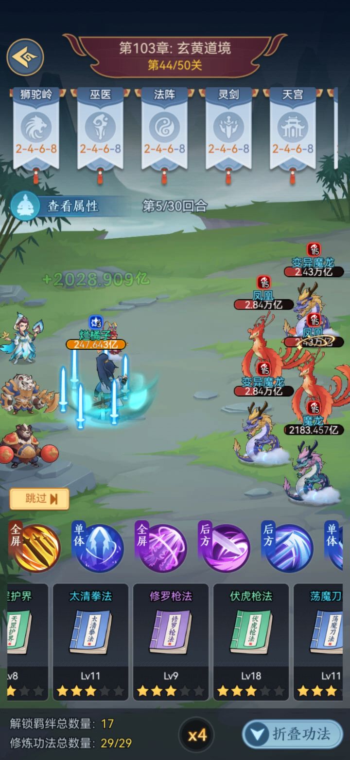 一共29技能,思路就是先点技能凑羁绊,29技能满后点3级四象,3级八卦,3级乾坤,我目前玄仙打103关,到44就最后几个技能没点满,其他都满了,到50的话就俩技能不满,其他都满