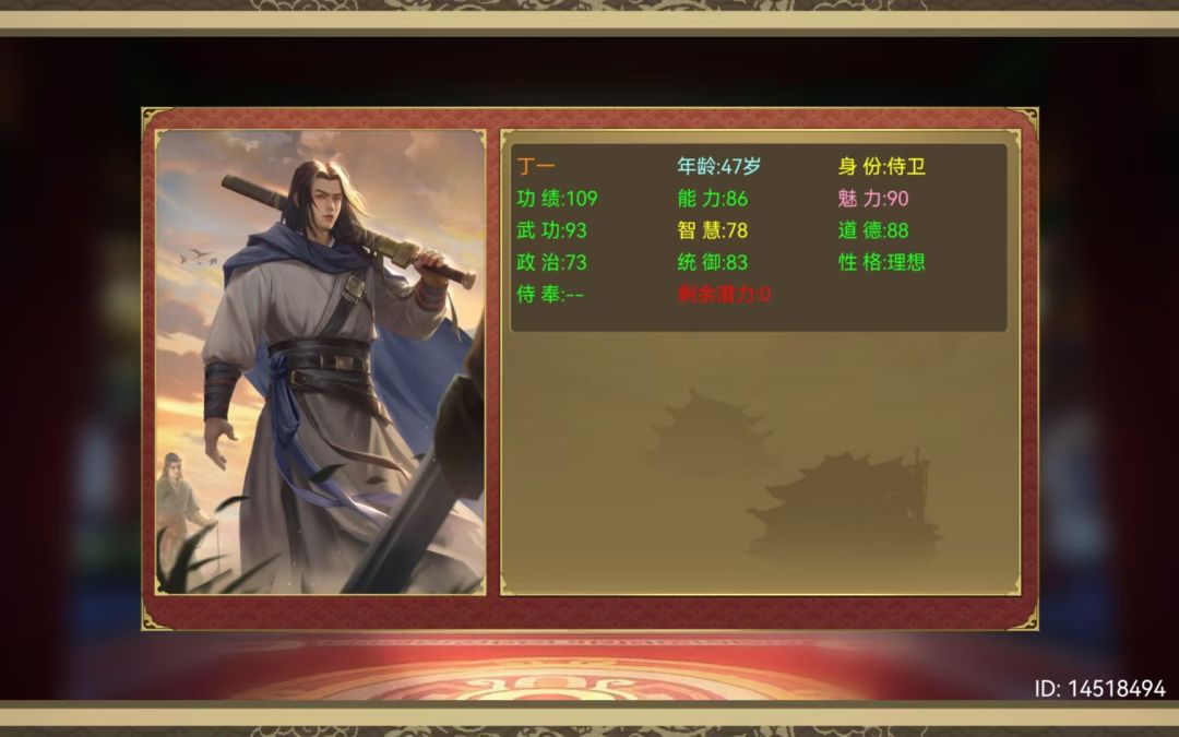 图4为丁一属性,武力93,智慧78,道德88,统御83,能力88,魅力90,年龄47