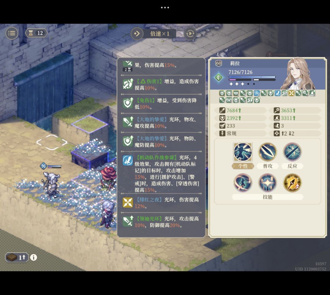除了攻击力提升外,还有一堆增伤效果:莉拉自身的鸢尾之姿增伤40%;绯红大光环增伤12%;长夜流光2增伤15%;4星小索个性光环给警戒增伤15%(5星25%);3星绿魔花田增伤10%(5星20%)。这个怎么计算我不懂请大神们指教,反正最后警戒效果是一刀小姐头(不屈所以2刀结束战斗),奥古由于职业克制应该在2刀解决,但是以莉拉的警戒效果来看,进警戒范围1刀、技能起手1刀,奥古也就能解决了。