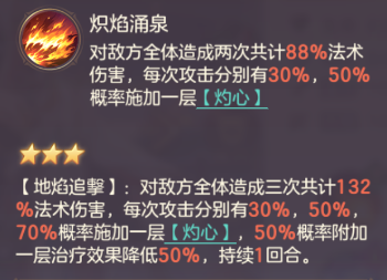 陆抗怒攻和普攻都能得到增幅强化,怒攻能被强化为地焰追击,普攻能被强化为焱击。从数值上看,强化后的怒攻和普攻都有着非常不错的系数(怒攻6*132%,普攻120%),对于以前的老神将高出不少,如果陆抗能有不错的输出资质(频率、各类高阶低阶的输出属性)的话,就有打出大量直伤的潜力。而怒攻能施加的“灼心”debuff,虽然看起来像灼烧系的buff,实际和灼烧没什么关系,是纯粹的属性削弱效果,能辅助我方输出。