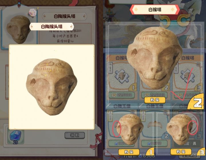 白陶猴头埙(xūn)(小):两个区别都在两边的耳朵上,耳朵轮廓都是大一些。