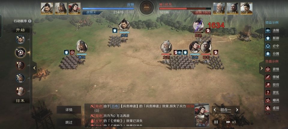 特别鸣谢给本文提供创作素材的玩家朋友,他在游戏里的ID名为“诶嘛”。利用乐进、曹纯和吕布摆出偃月阵,正面遭遇到了左慈、陆逊和田丰的队伍,只照面了一个回合就击溃了陆逊。头号火力输出点被拔掉,也可以看作是一回合就锁定了胜局。相信各位也很好奇,这场闪电战是如何成功的,所以我专门把细节整理在了下文的段落里,方便各位参考借鉴。