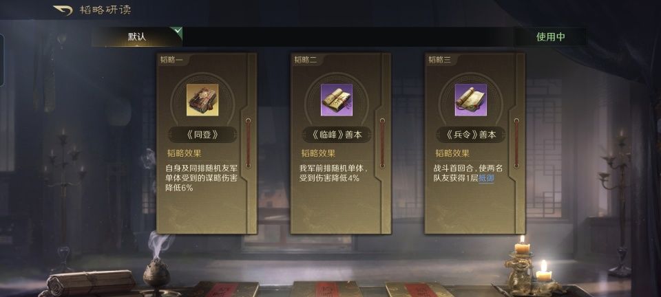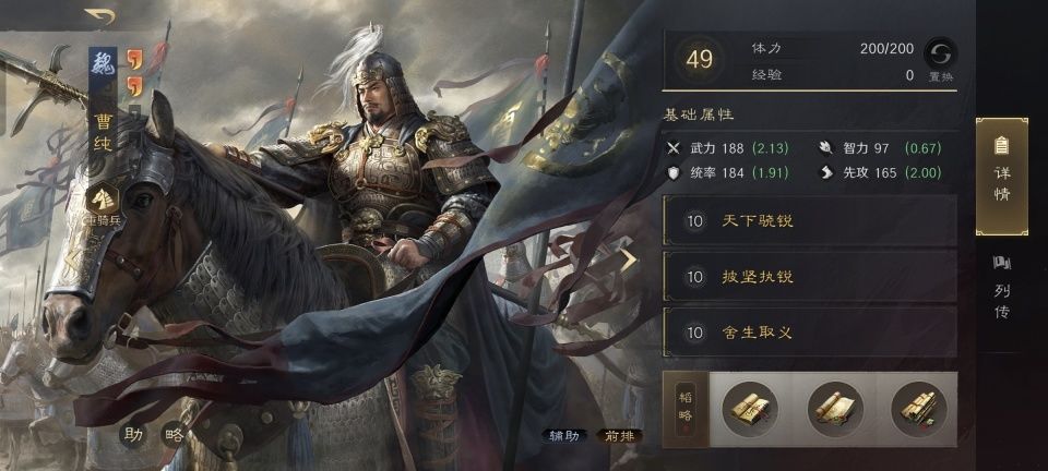 乐进战法:每战先登+战八方+无难之志。韬略库:同登(专属)+临峰善本+兵令善本。重骑兵特性坚韧,专精点亮铁马金戈。