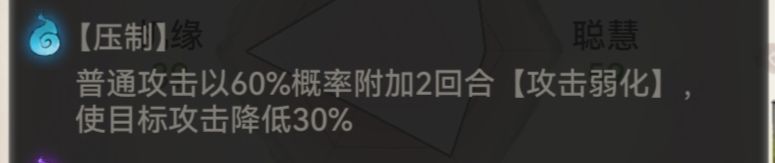8、压制:普通攻击以60%概率附加2回合【攻击弱化】,使目标攻击降低30%,起到了削弱敌方输出的作用。