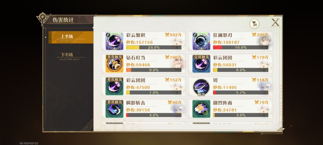 灰域打完咯,二队我是玩未来+云+深海,核心思路是利用连协去输出可以看到伤害占比(图5)未来的输出根本没有哈哈哈哈,开个玩笑,全是连协打的12层反弹怪和盾怪,刮了1分22,其实应该玩特性流,可以更稳定输出无敌帧更稳,图上是普攻流,就一股脑全靠普攻,就会比较危险。