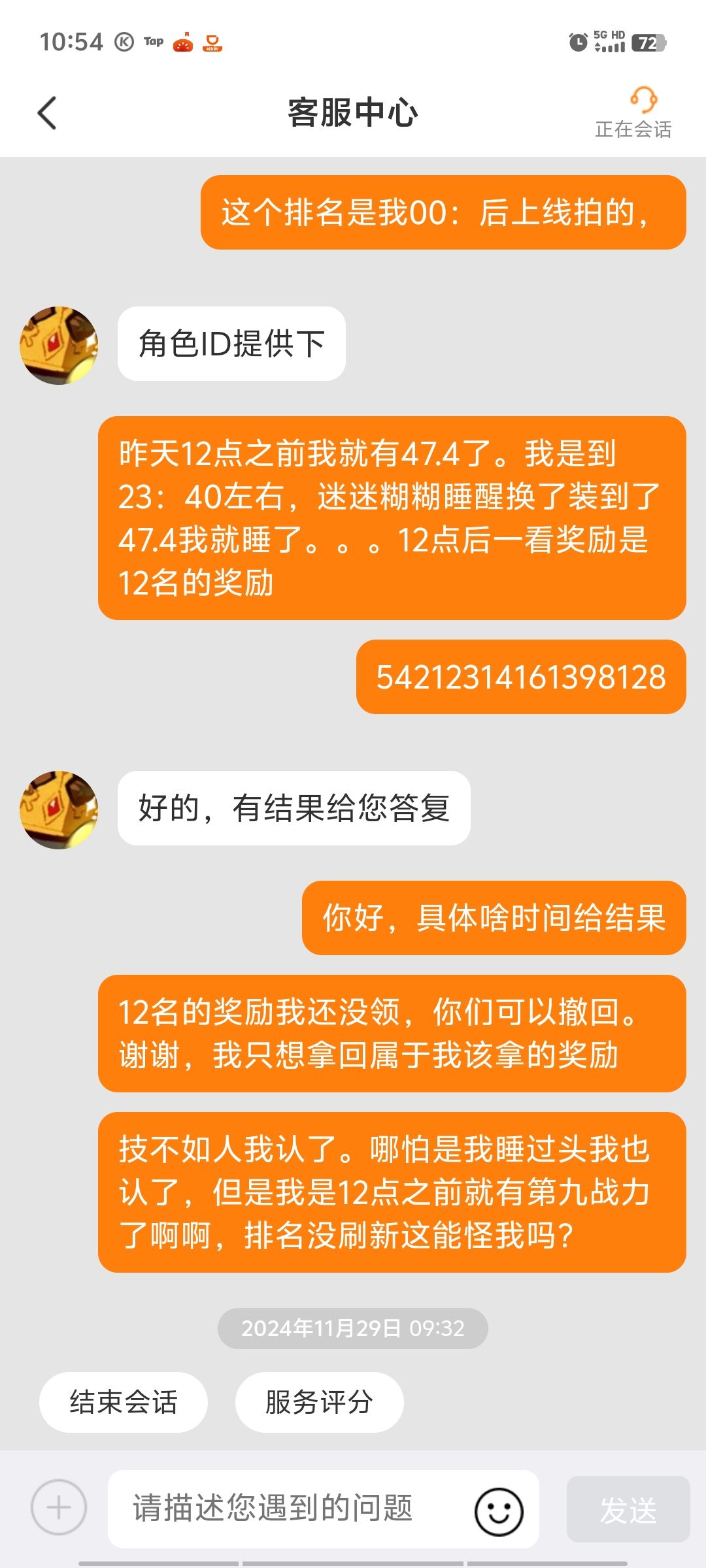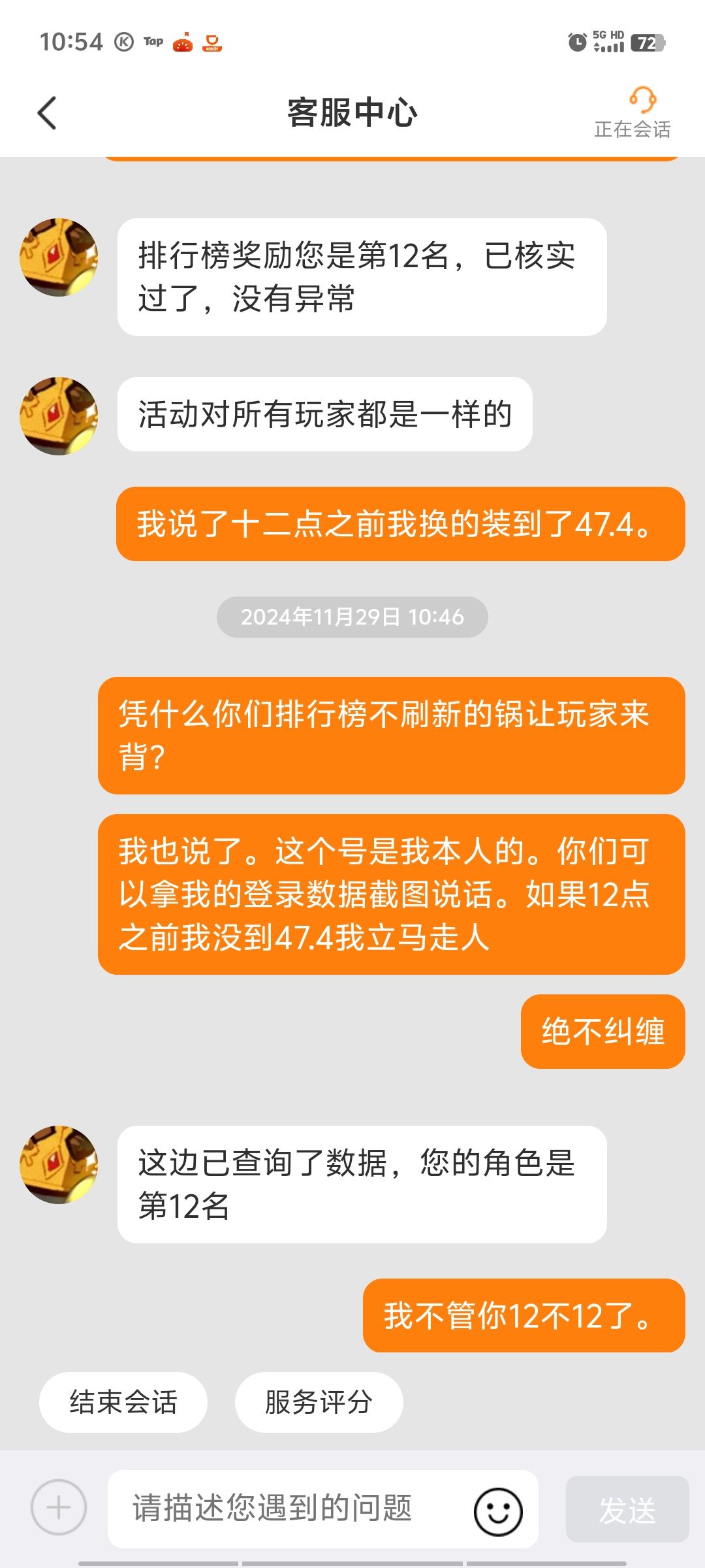 我来说说我的,乔斯林专属神器活动。我23:40多调的属性到了47.4第九名,排行榜没刷新,因为我这边有熄灯就寝制度。我是忍着困意迷迷糊糊操作的,到00点以后。我又上线想领奖励来着。结果是12名的奖励。找客服客服就一句话,我排12名。没专属神器奖励。。。。因为游戏才开了一个月。bug很多。几乎天天更新,我让他拿我12点之前的战力数据对比排行榜战力,如果比他们低。我立马走人,甚至道歉。但客服牛逼。就是不敢给数据。就说你第12,这是我的一周时长 。。。。。嗯。。。奉劝大家能别玩就别玩,能不米就不米。。。。嗯。#佣兵小镇