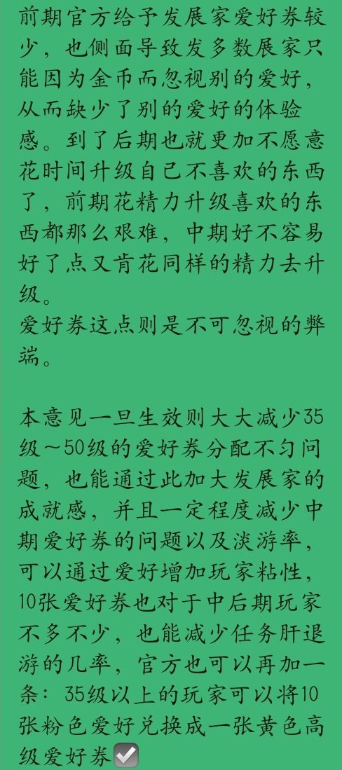 打比方:新手玩家小a喜欢钓鱼,烹饪。因为有成就感且获得金币高(有性价比)。而观鸟和捕虫就相对没有那么喜欢(官方提到的需改进,小a又get不到玩的点),那么又在前期爱好券没那么多的情况下,小a就会用爱好券优先升级钓鱼和烹饪,而不是观鸟与捕虫,20~30级小a就会因为对于爱好的热爱从而进行对于该爱好相关运动,而到中期小a喜欢的爱好烹饪和钓鱼就会优先到满级,而此时爱好券则泛滥成灾,无法处理,那么小a会有两种选择㈠去玩别的爱好㈡偶尔有时间才会玩,只是为了应付任务。可是而大多数玩家会选择第二种。