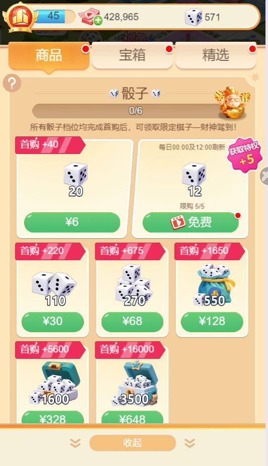 商品骰子:每日0点和12点会刷新,每次刷新有5次广告机会,一次广告可获得12个骰子。一天累计可获得120个骰子!