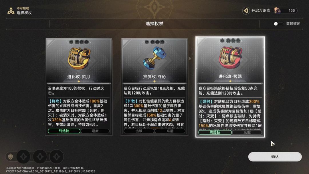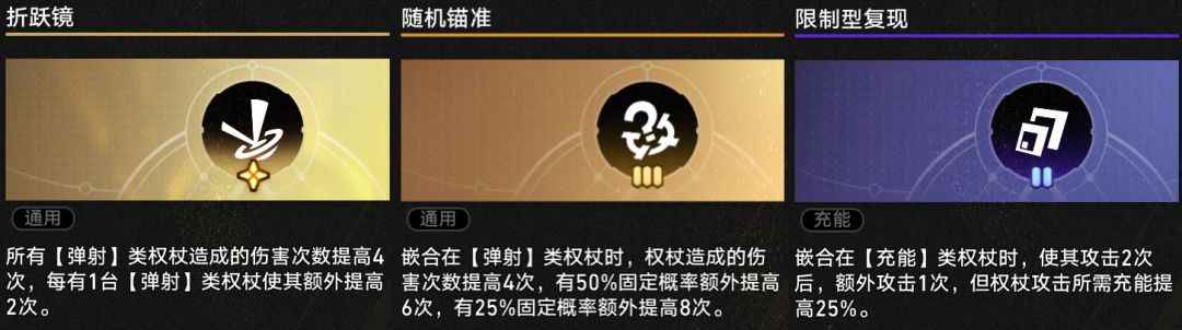 这里【限制性复现】建议只用二级(紫色)的——因为二级的【限制性复现】从第二轮攻击开始就可以保证稳定翻倍权杖的攻击段数了,升到三级基本只是加快启动速度,但权杖的充能压力会大幅提升。