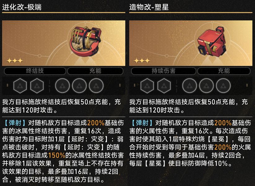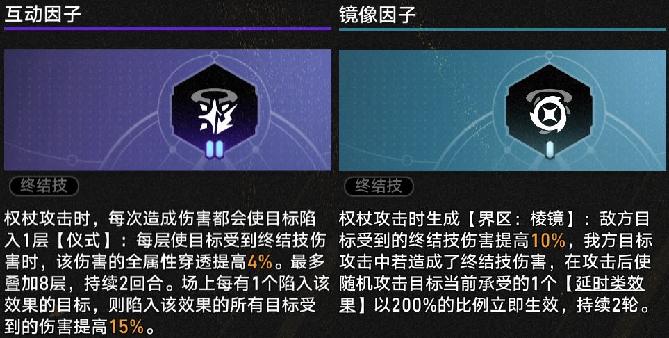 这里我们让【造物改-塑星】来给飞霄充能,然后给【进化改-极端】堆高增幅进行伤害输出,有效降低给飞霄充能的那根【弹射】权杖的伤害占比。进一步的,【进化改-极端】和其附加的【延时:灾变】是终结技伤害,而【造物改-塑星】不是,所以安装【互动因子】和【镜像因子】可以进一步降低【造物改-塑星】的伤害占比,并提升通关速度。