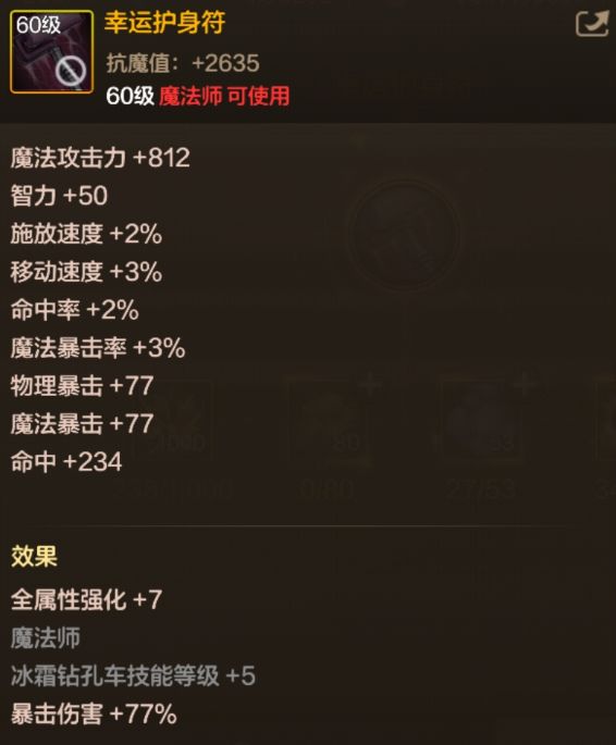 幸运护身符的主要提升在暴击伤害和冰霜钻孔车的技能等级,也就是魔道玩家需要通过堆暴击数值和多使用冰霜钻孔车技能来打出高额的伤害,带来的整体提升很大,尤其是暴击率越高伤害越稳定,暴击伤害加成的属性收益越大。