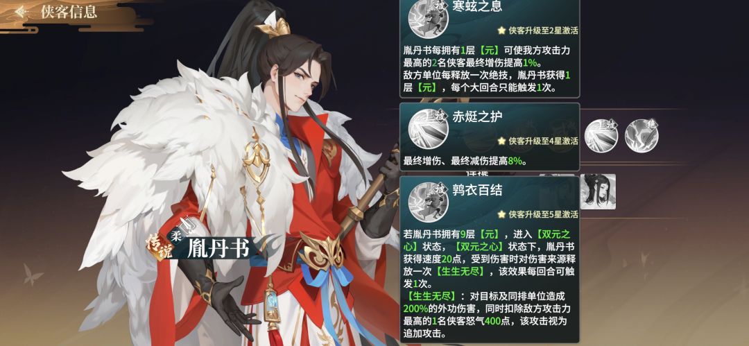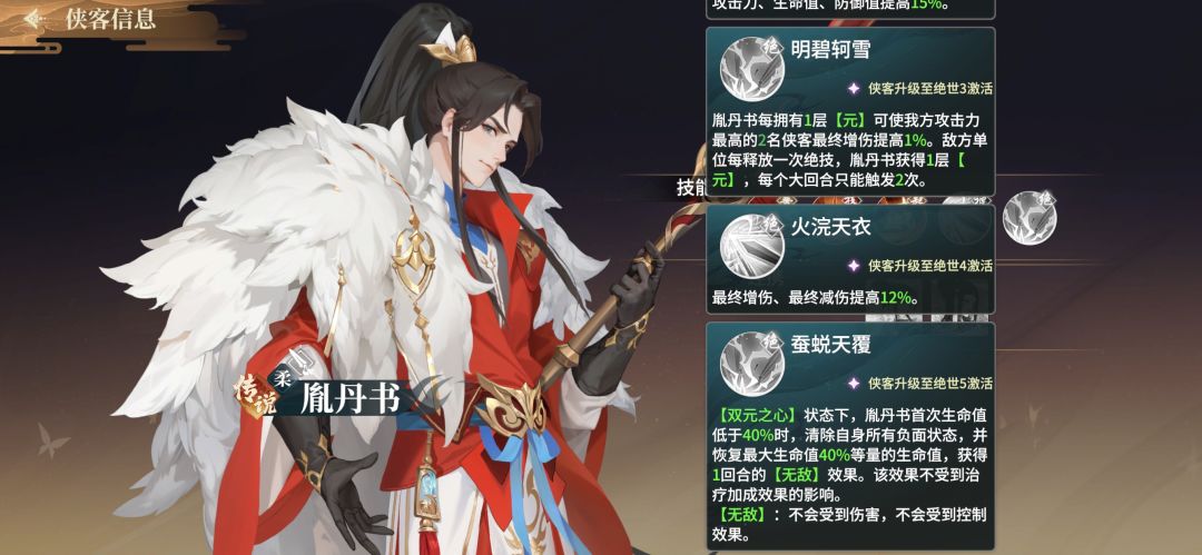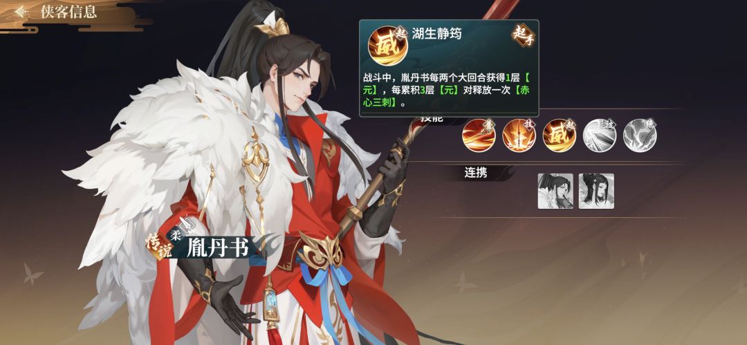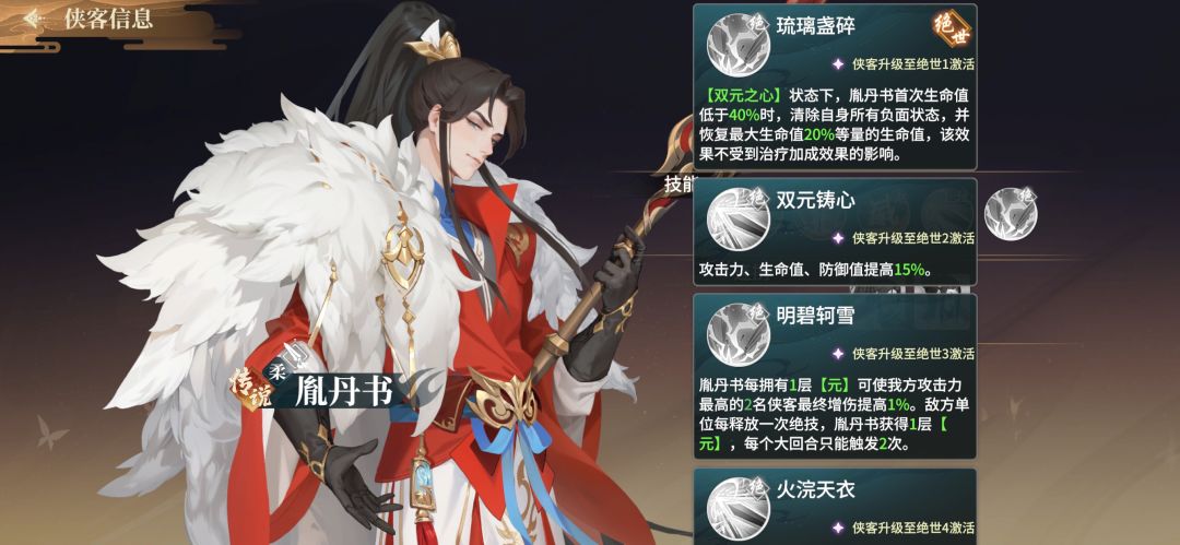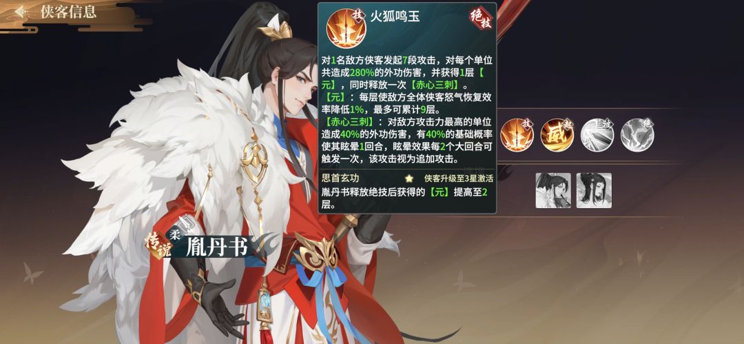 2、每积累三层元释放一次赤心三元,对攻击最高造成40%外功伤害,并40%几率眩晕一回合(眩晕每两个大回合触发一次)。