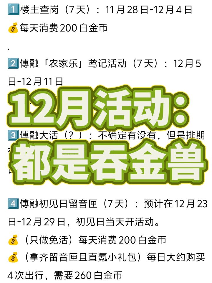 除此之外,12月可能会有新卡池,以及不清楚是否会上傅融大活,到时候可不要急着把白金币积蓄都用空了[捂脸R],个人建议大家这个月尽量留1k到2k的白金币来周转。
