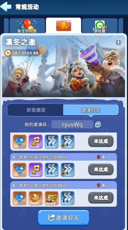 常规活动﹣>懔冬之邀﹣->输入邀请码!