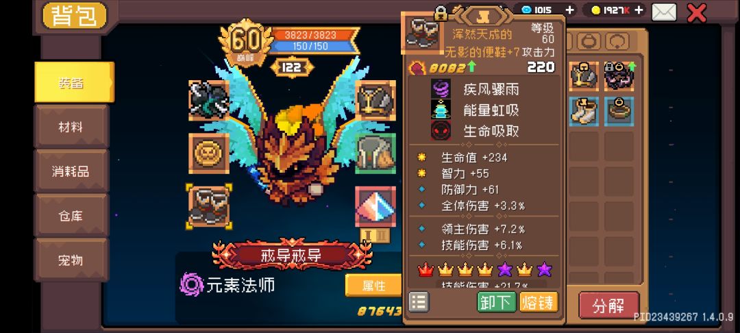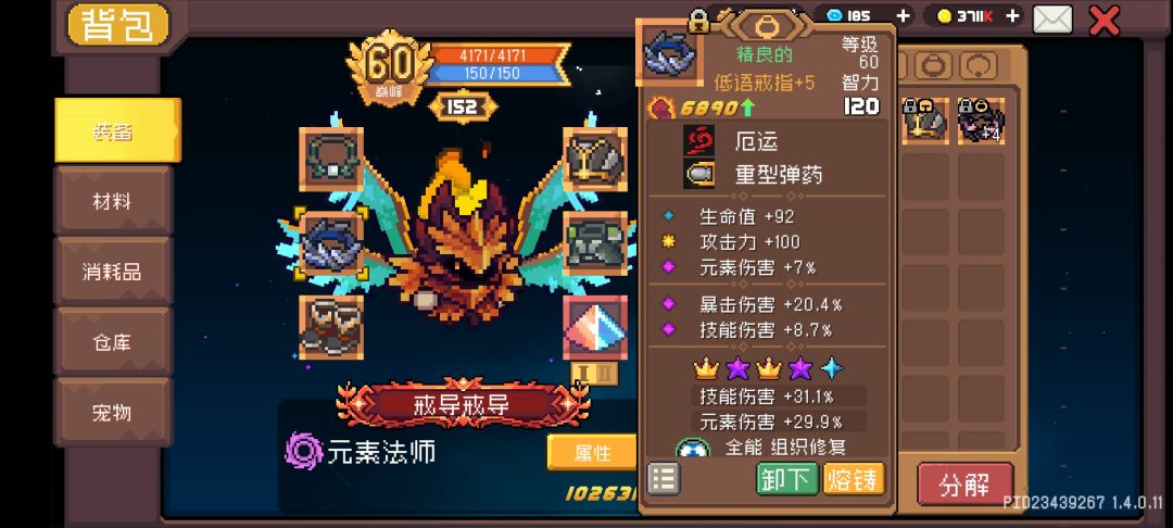 器灵也是遵循有啥用啥,攻击我推荐元素石之灵增加元素石套装效果,紫色也比较容易获取,同时自带buff元素强化可以增伤15%元素伤害。另外的有啥用啥。