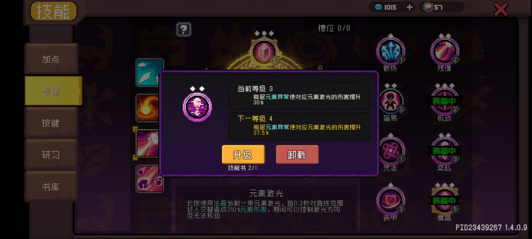 主要输出技能为元素激光,搭配上魔晶专精、专属红武和分裂羁绊可以干出4条激光(这法师一看就是多了),不过我可能会只开2分裂,3分裂好像有点多余,之后我再测试。
