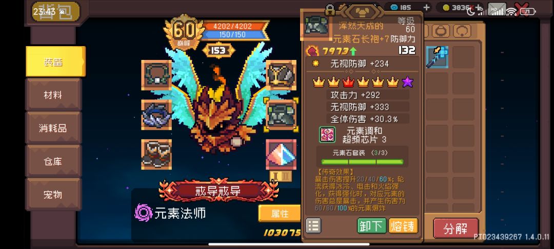 护甲:元素石长袍。3元素石套装效果可以增加60%暴击伤害,并且让元素伤害必暴击,还有产生额外100%元素爆炸,配合上元素调合,必然相当爆炸!