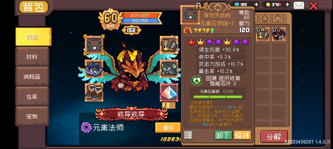 项链:元素石项链,加上器灵凑齐3元素石套装效果。必暴,暴伤+60%,并且提供100%额外元素伤害爆炸。