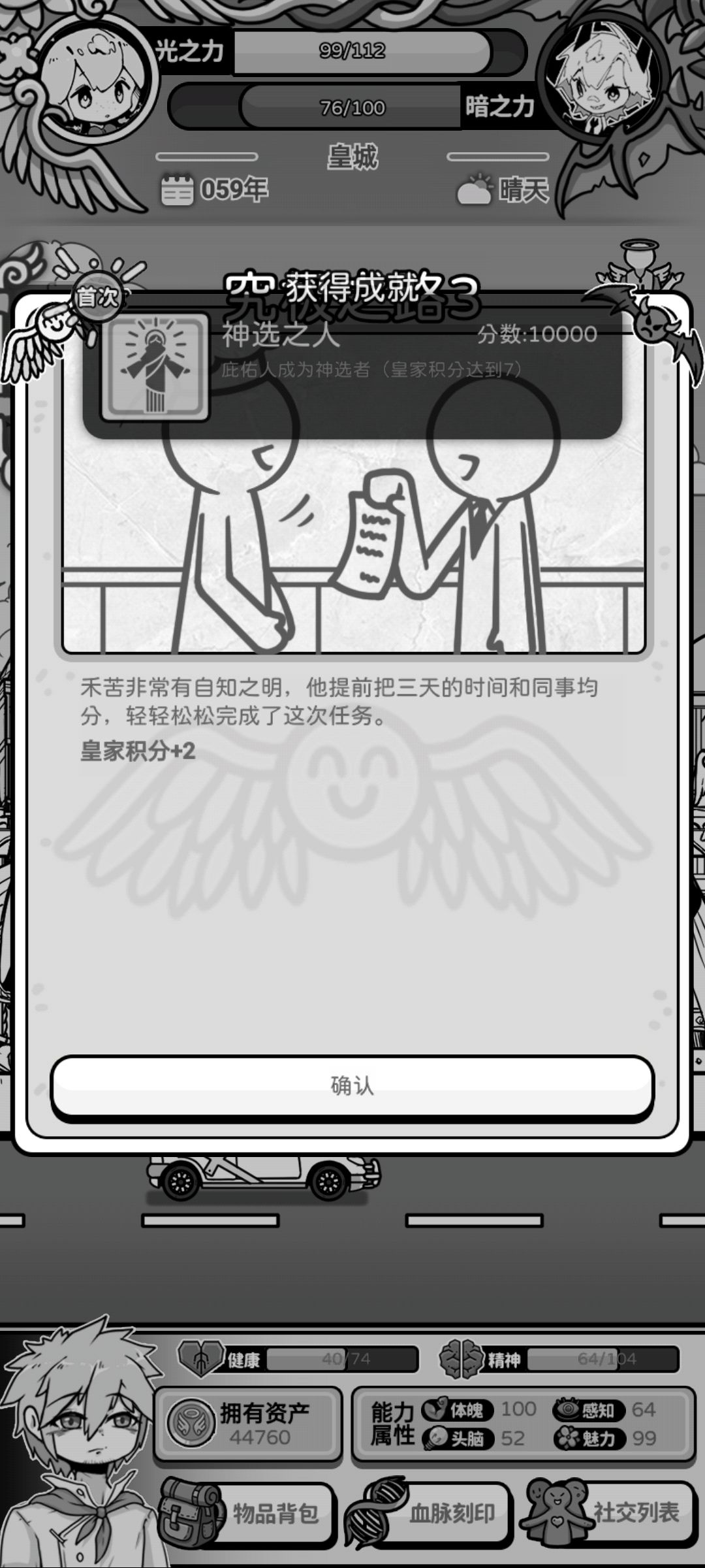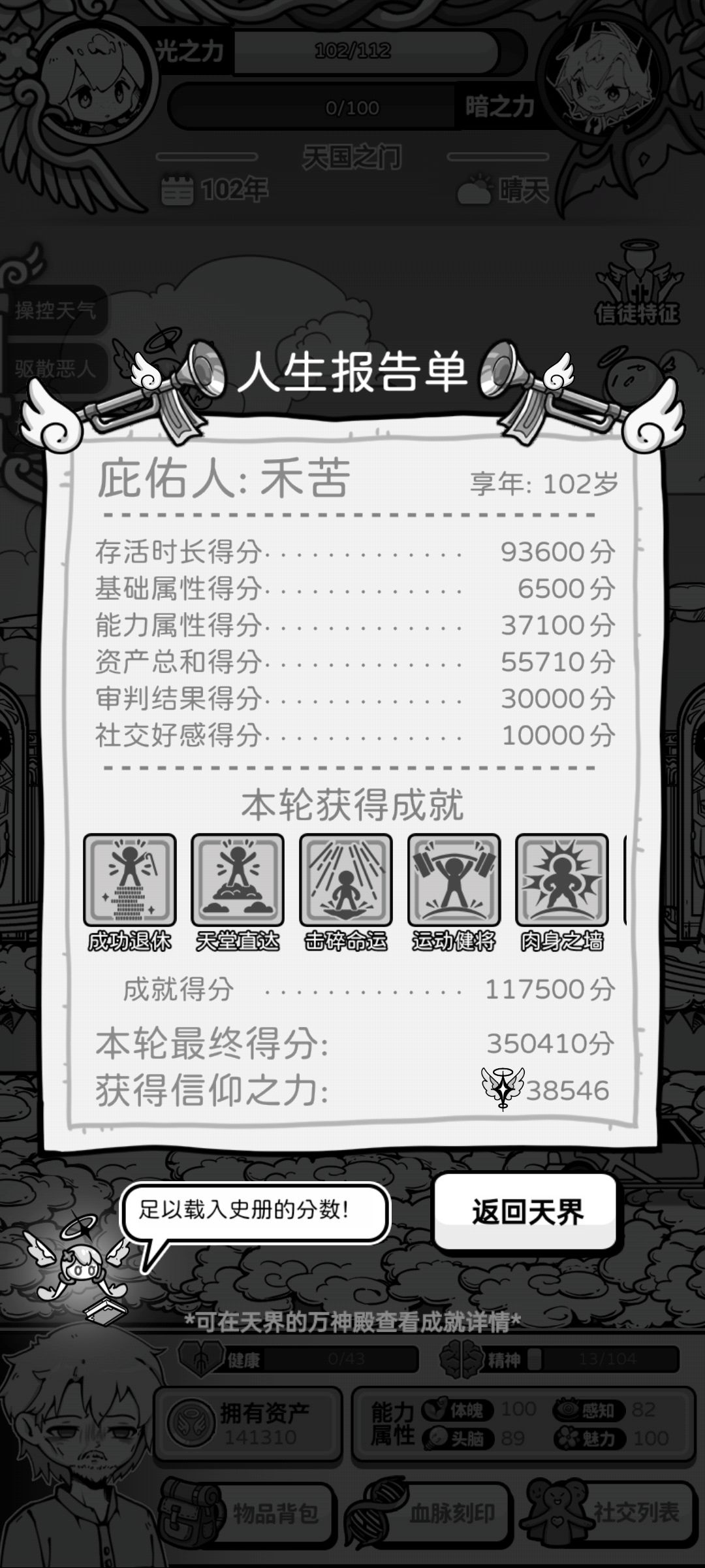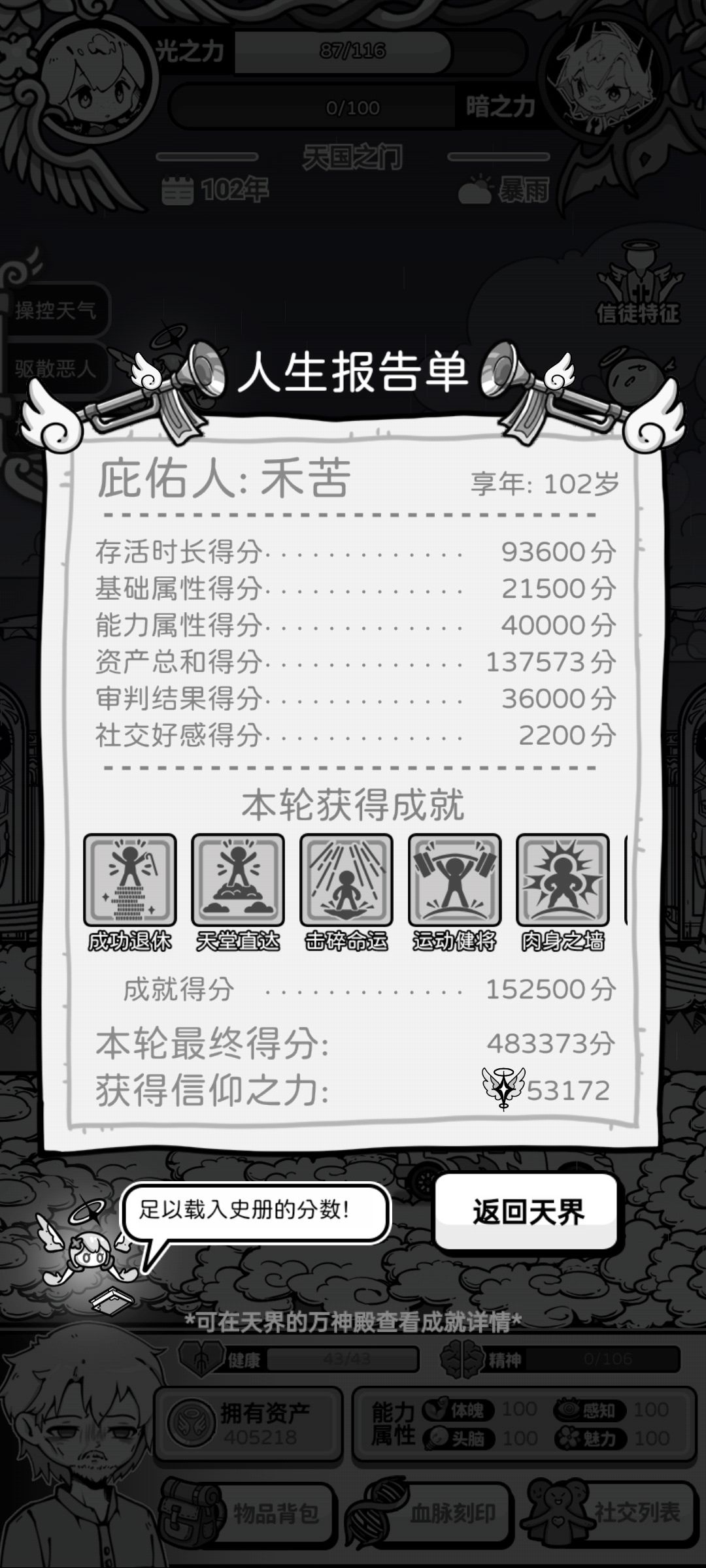 分数似乎和资产关系比较大(房车buff永久的后面天堂阶段也能蹭到钱似乎),社交和一个人满就够分了,三个人满好感结算界面得分也没有提升(所以一个100结婚两个60好感触发成就应该就够了)……
