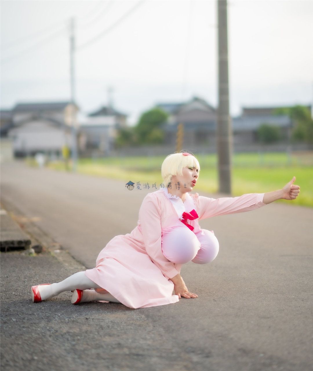 今天,博士一如既往地在网络社群里闲逛,看看有没有什么有意思的内容可以和大家分享。忽然,一张显眼醒目的照片映入了我的眼帘,一位明显是男人假扮的金发“美女”侧坐在大马路上,伸出的手比出了一个大拇指,这在国际上是一个请求搭车的手势,“她”可能是在施展美人计,想搭个顺风车吧?另外,为了散发魅力,哥们的装扮实在过于夸张,胸前的两颗大西瓜太假了!