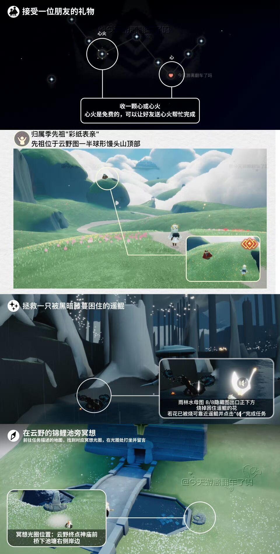 《光遇》游戏中每天的每日任务及大蜡烛的位置都不相同,玩家完成每日任务及收集大蜡烛都可以得到丰厚的兑换奖励,奖励可以用于兑换各种动作及道具,不过很多小伙伴不知道每日任务怎么做,又懒得自己去找大蜡烛的位置,我们汇总了每日任务的完成攻略以及蜡烛位置,一起来看看吧!