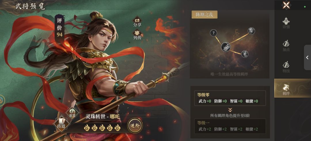 武将羁绊:陈塘之乱,和李靖、龙王敖丙有羁绊加成,武力、防御、智谋、敏捷全部+2,二级羁绊则全部+4