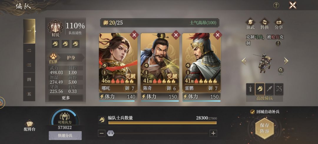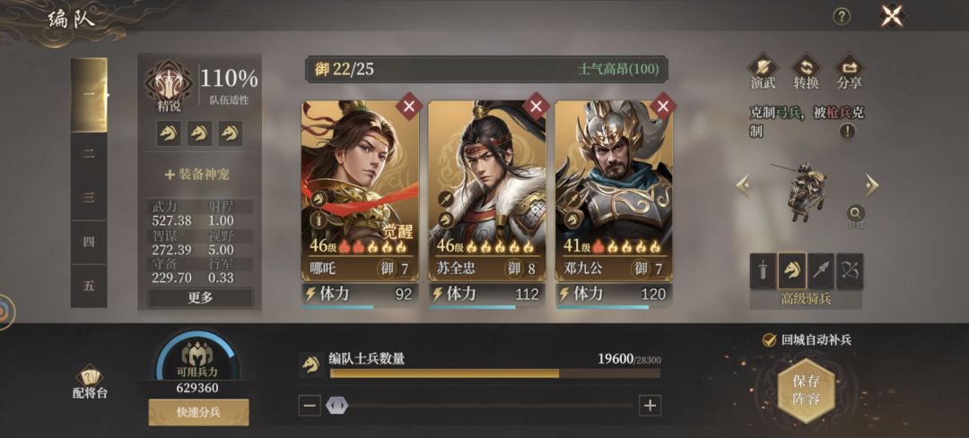 这套阵容是已哪吒为核心搭建的纯攻爆炸输出流,三人适配兵种都为骑兵,能获得高额的骑兵属性加成。