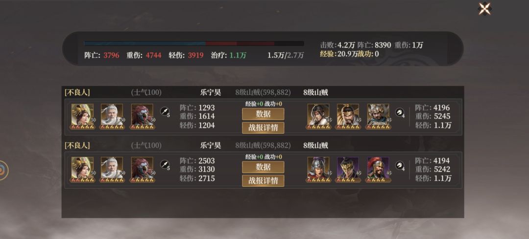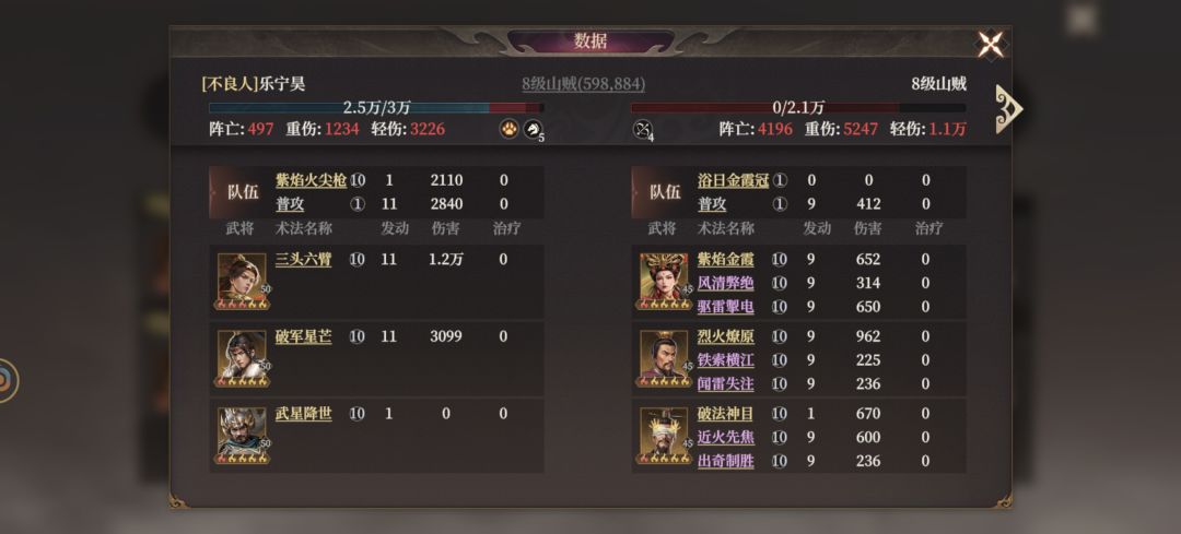 这套阵容开荒非常不错,不管是对战兵种克制自己的枪兵还是自己克制的弓兵都能打出不错的效果,损耗很小(以上数据都是没有携带其他术法的情况下测试)基本上属于八级地及其以下资源,都是无脑单挂刷,非常简单暴力,如果搭配上不错的其他术法,可以做到无伤刷野,非常强势,推荐术法带大额加成武力值的或者能打出特效流的(比如说流血、连击等),纯爆炸输出流,不需要治疗,轻松单刷九级资源地。