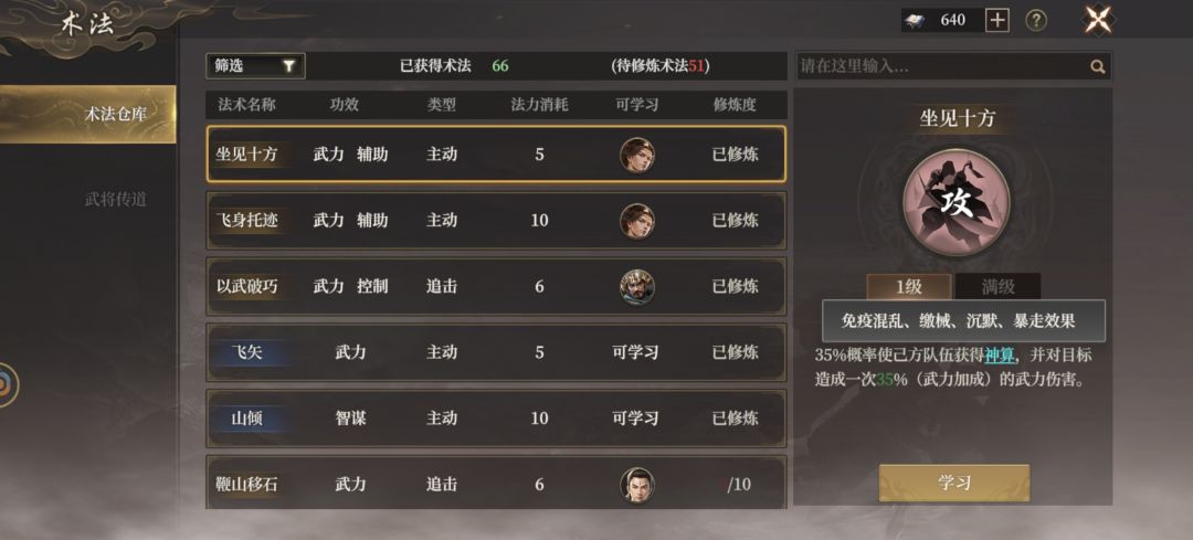 这样看可能不如搭配陈奇那套,其实不然,这套可搭配的术法更加全面,搭配上术法之后,会比第一套阵容搭配术法作用高,因为这套术法选择很全面,只要搭配武力术法都会有不错效果,最优选择是搭配带有治疗、免疫、加武力伤害的术法,之后能单刷九级或者10级地,非常强势。