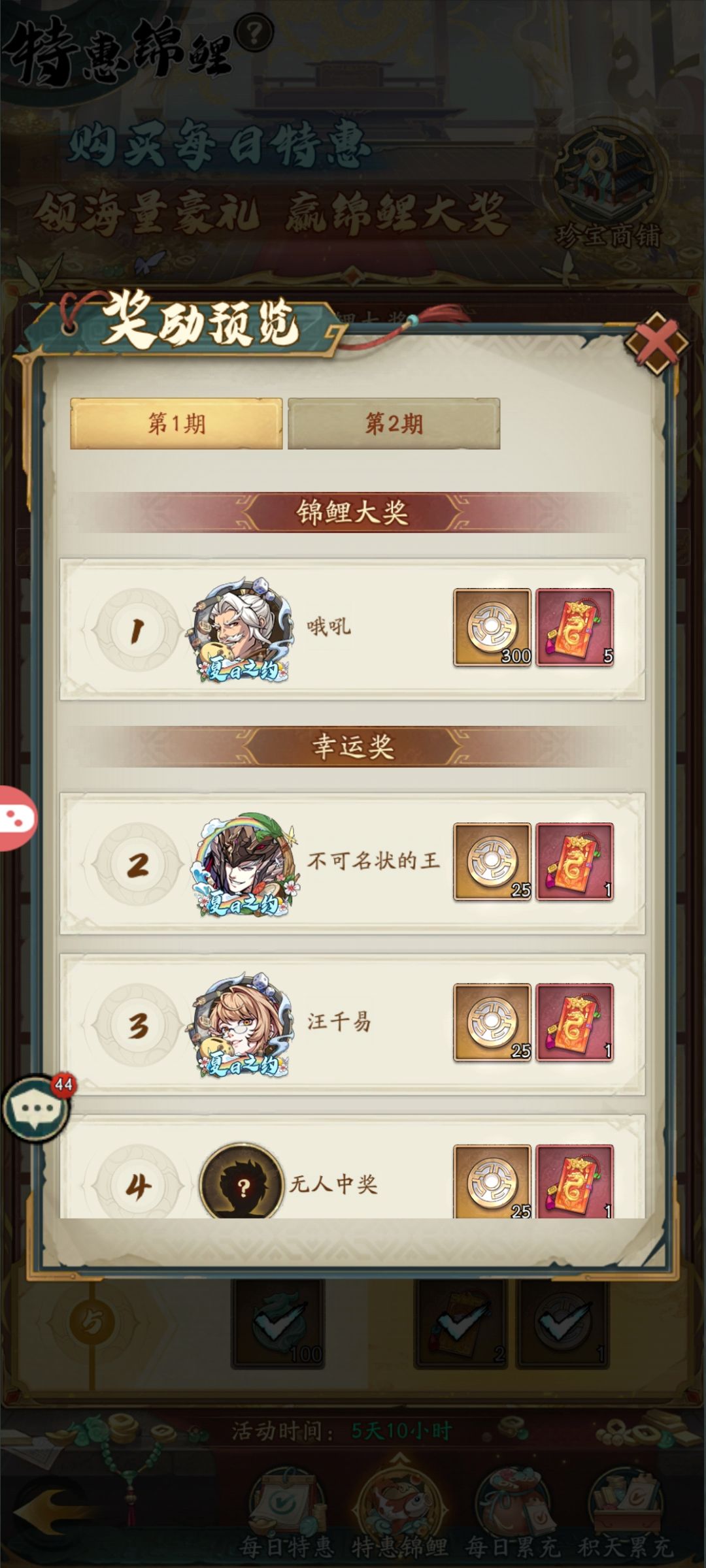 第二 特惠锦鲤会给300珍宝币 我们区第一天就3个人买了可惜我没拿到特惠锦鲤 要不然直接白嫖一个95神魔 就算没拿到也有幸运奖 (95神魔就是现在最好的将这憨憨游戏礼包敢卖648一个!所以搏一搏不吃亏 就算没博到 也会给一些珍宝币慢慢攒)