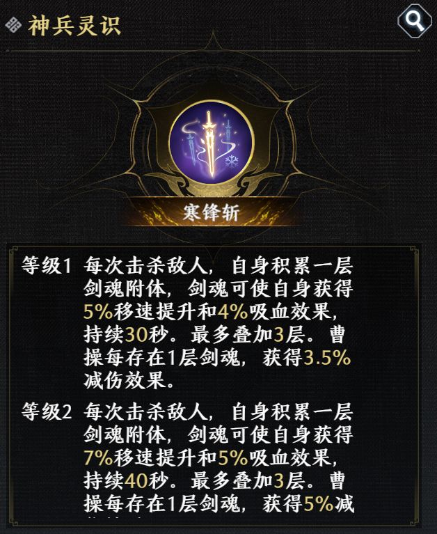 【寒锋斩】每次击杀敌人,自身积累一层剑魂附体,剑魂可使自身获得一定移速提升和一定吸血效果,持续若干秒,最多叠加3层。曹操每存在1层剑魂,获得一定的减伤效果。