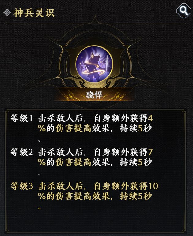 在投入总点数达到6点,且神兵觉醒+6后,可点亮【睥睨天下】的相关灵识,其灵识分支分别为【冽影击】、【寒锋斩】、【冰刃破】、【霜华怒】。【冽影击】每次击杀敌人,自身积累一层剑魂附体,剑魂可使自身获得一定移速提升和一定吸血效果,持续若干秒,最多叠加3层。进入战斗时立即获得1层剑阵效果,且有一定概率额外获得1层剑阵效果。