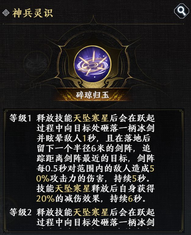 释放技能【天坠寒星】后会在跃起过程中向目标处砸落一柄冰剑并眩晕敌人若干秒,且在落地后留下一个剑阵,追踪距离剑阵最近的目标,剑阵每隔一段时间对范围内的敌人造成伤害,持续若干秒。剑阵每次命中附带一定减速效果,持续若干秒。 它与【碎琼归玉】互斥,二者只能选一个点亮。