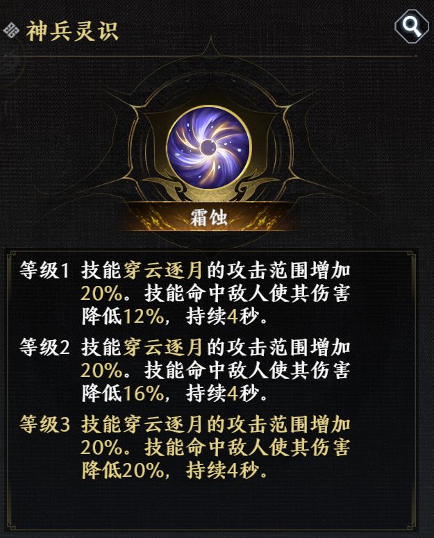 技能【穿云逐月】的攻击范围增加。技能命中敌人使其伤害降低,持续若干秒。该灵识主要以用于为曹操争取更多生存空间,改善曹操身板较脆的现状。