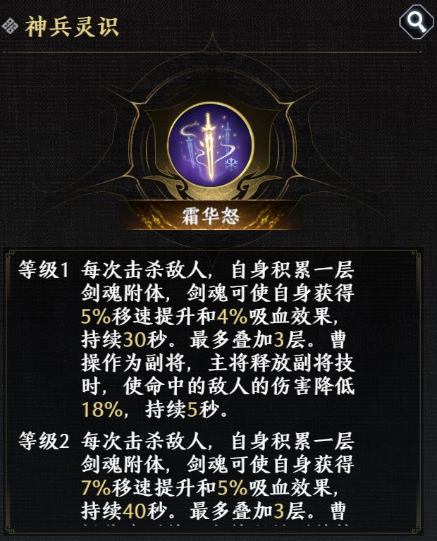 【霜华怒】每次击杀敌人,自身积累一层剑魂附体,剑魂可使自身获得一定移速提升和一定吸血效果,持续若干秒,最多叠加3层。曹操作为副将,主将释放副将技时,使命中的敌人的降低一定伤害,持续若干秒。【霜华怒】只在曹操作为副将登场时点亮。
