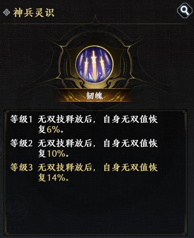 投入总点数达到4点,神兵觉醒+4后,可点亮【十方俱灭】的相关灵识。其灵识分支分别为【韧魄】、【悍勇】。【韧魄】无双技释放后,自身恢复一定无双值。
