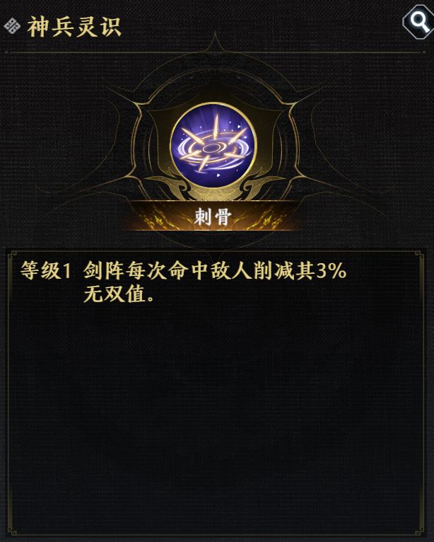 【刺骨】:剑阵每次命中敌人削减其一定的无双值;