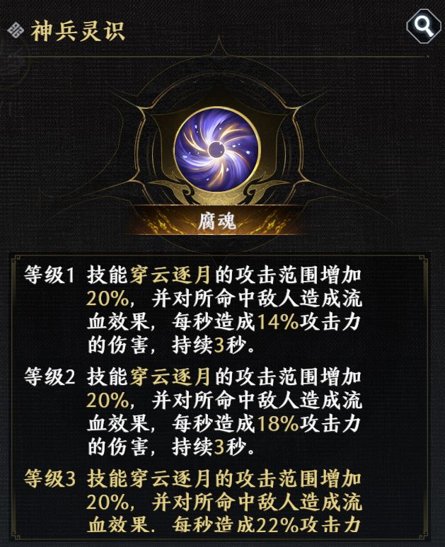 技能【穿云逐月】的攻击范围增加,并对所命中敌人造成流血效果,每秒造成百分比攻击力的伤害,持续若干秒。 它与【霜蚀】互斥,二者只能选一个点亮。【腐魂】以伤害为主,适用于大部分PVE场景,或想在PVP中想要打出爆发伤害,也可以选择点亮该灵识。