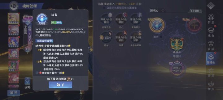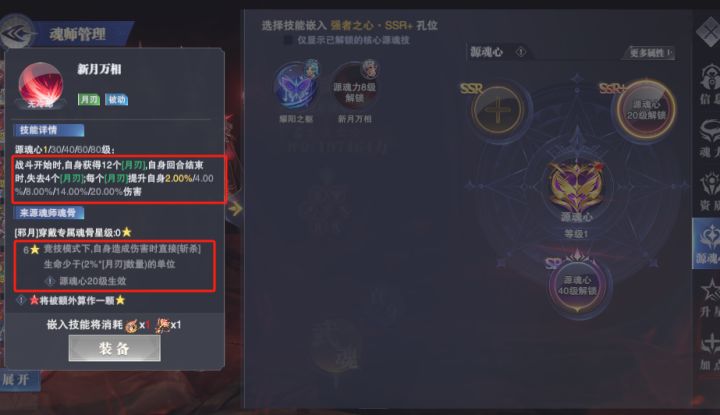 就如我们看到的,升了源魂心的千道流分别可以激活左侧的ssr源魂心技能和右侧的ssr➕源魂心技能(sp道具暂未上线)我们可以看到激活这个需要该魂师6级源魂,并且激活时要消耗一个该魂师源魂和对应的ssr或者ssr➕对应道具所以我们要提前留出来