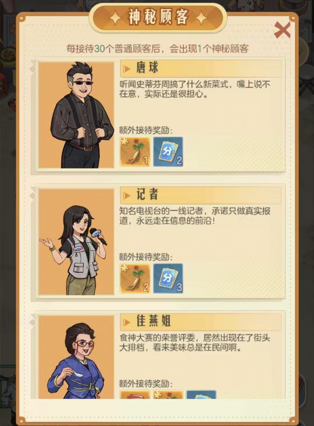 每接待30位普通客户,会遇到一位神秘顾客,带来额外的接待奖励和体力。
