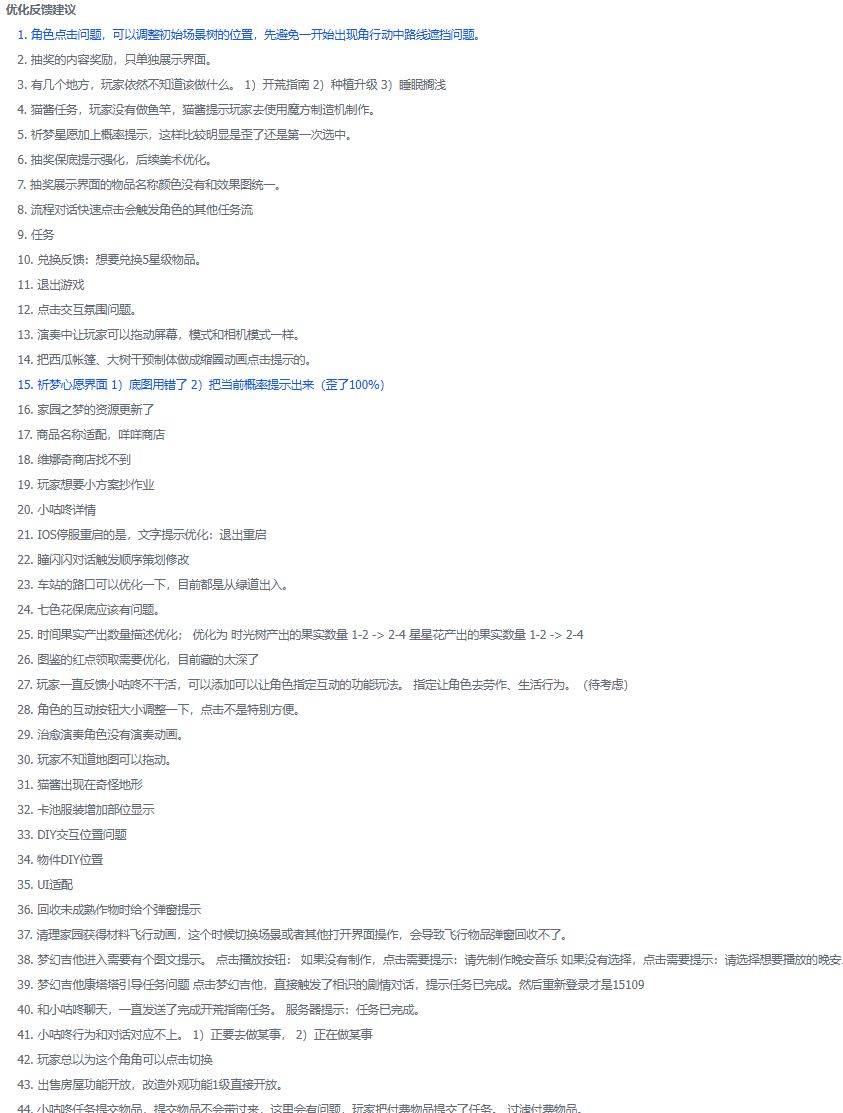 5、优化建议:各位森民的体验反馈已经塞满了我们的记录文档。这些森民们深度体验过后提出的优化建议对我们来说弥足珍贵,我们会仔细斟酌,并排列优先级,进行评估和优化。比如出售房屋、更改房屋外观、装扮贴图适配等内容会优先做好,而一些需要额外开发的内容,限于时间和人手,会放到公测版本稳定后再进行开发。