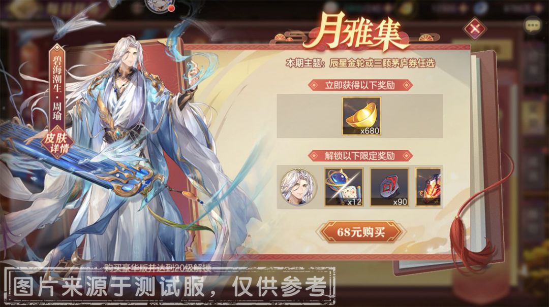 小将军可以通过每个月度完成“每日任务”获取月雅集进度,解锁“月雅集”标准奖励。另外,额外付费68元解锁“月雅集豪华版”后,达成指定等级可获得每月限定史诗级皮肤(本月为碧海潮生·周瑜)、主题奖励(本月为辰星金轮或三顾茅庐券任选)等资源,助力小将军闪耀三国!同时,月雅集皮肤常驻返场将更换为莹玥焕阑·张星彩、神威罗刹·曹彰!