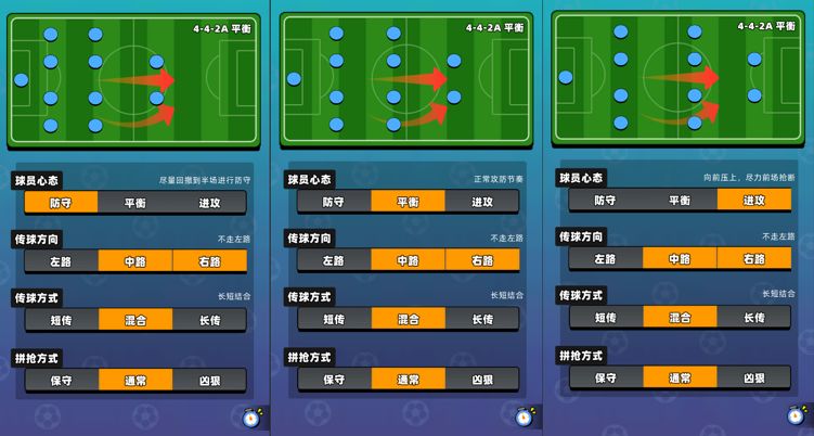 不同的阵型有不同的效果,有擅长突破的进攻阵型,有擅长反击的防守阵型,以及攻守兼备的平衡阵型。