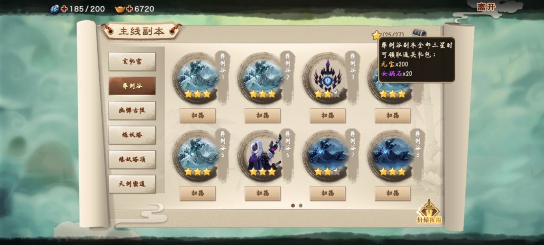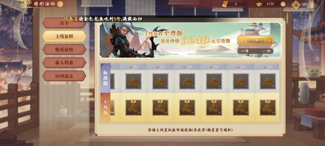 还有就是主线副本区域满星通关可获得200元宝,根据副本数量依次领取,目前为止我只领了3000元宝左右,这是我刷本慢的问题,这个确实可以领不少,但是由于刚开服,我也不太确定具体多少,保守估计上w简单。