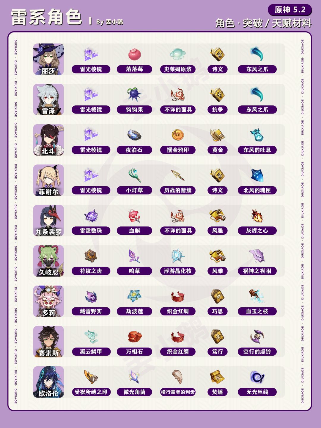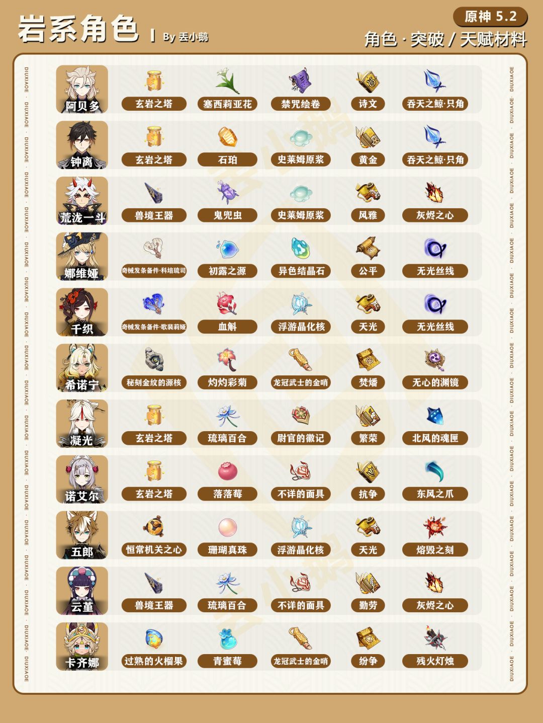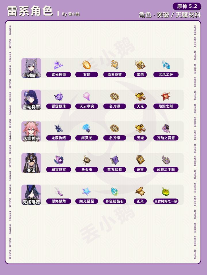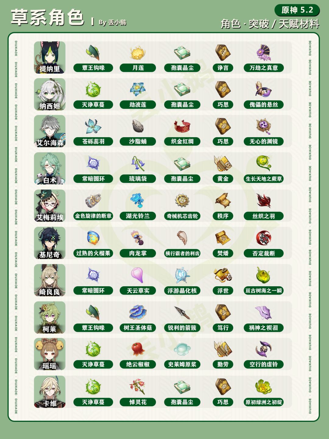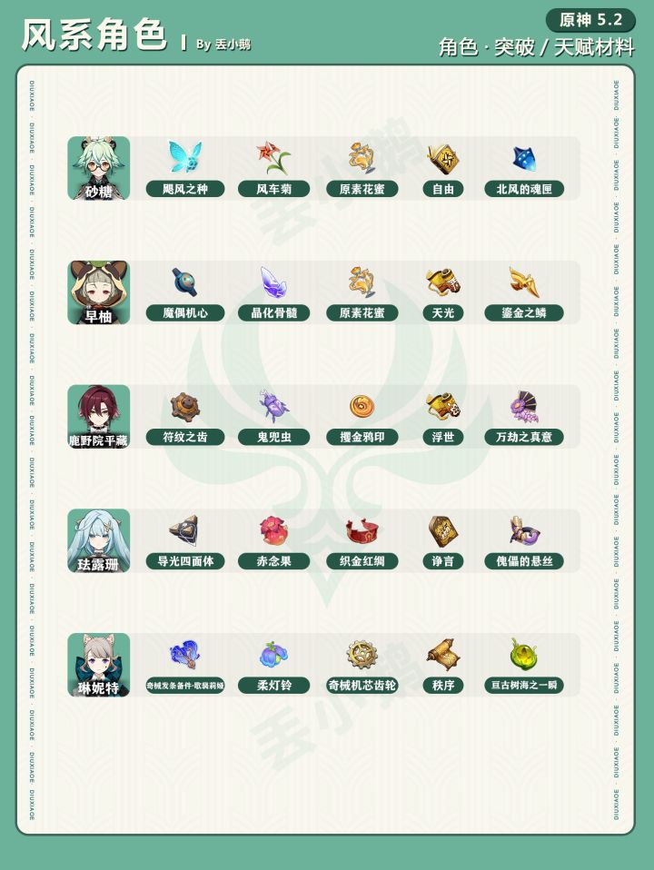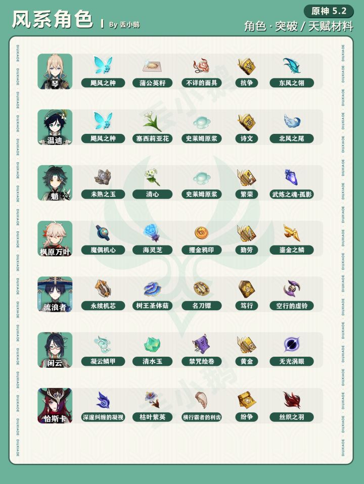 为你带来【原神5.2】全角色突破/天赋材料一览表~